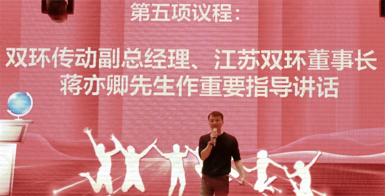 双环传动总经理MIN ZHANG,双环传动副总经理、江苏双环董事长蒋亦卿,江苏双环总经理卢浩,副总经理汪土华、赵俊杰、陈香籽,江苏双环各部门长及公司2022年度先进人物、获奖代表、10-20年工龄奖获得者和部分员工代表共200余人出席了此次会议。