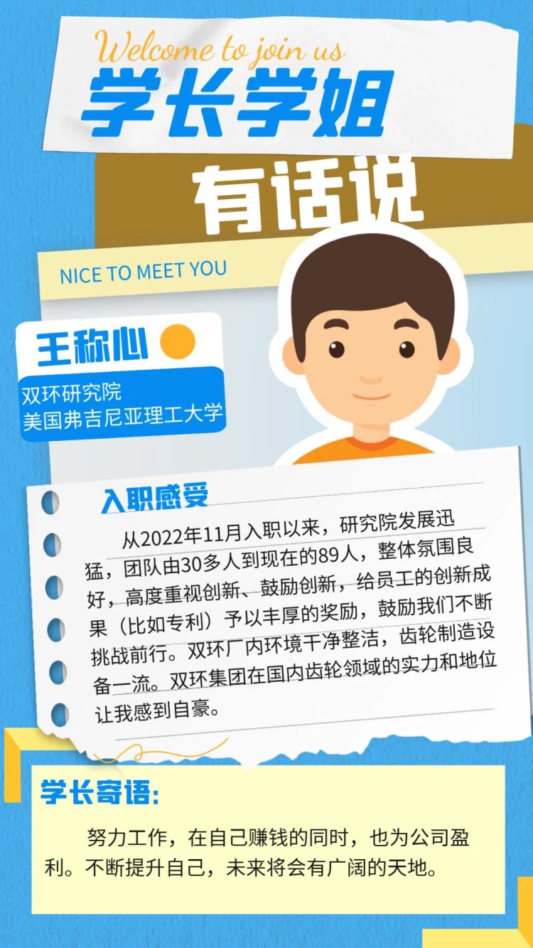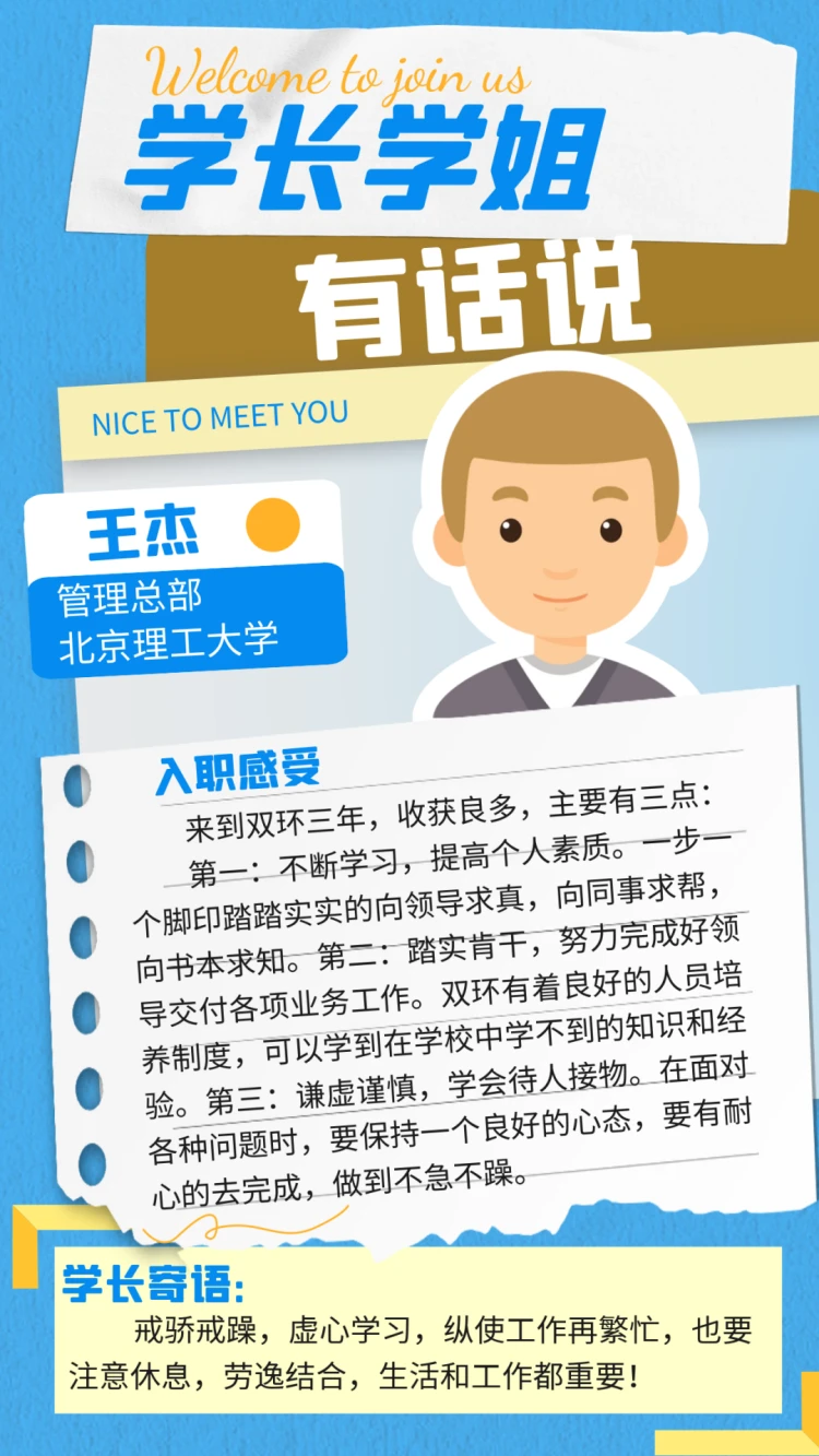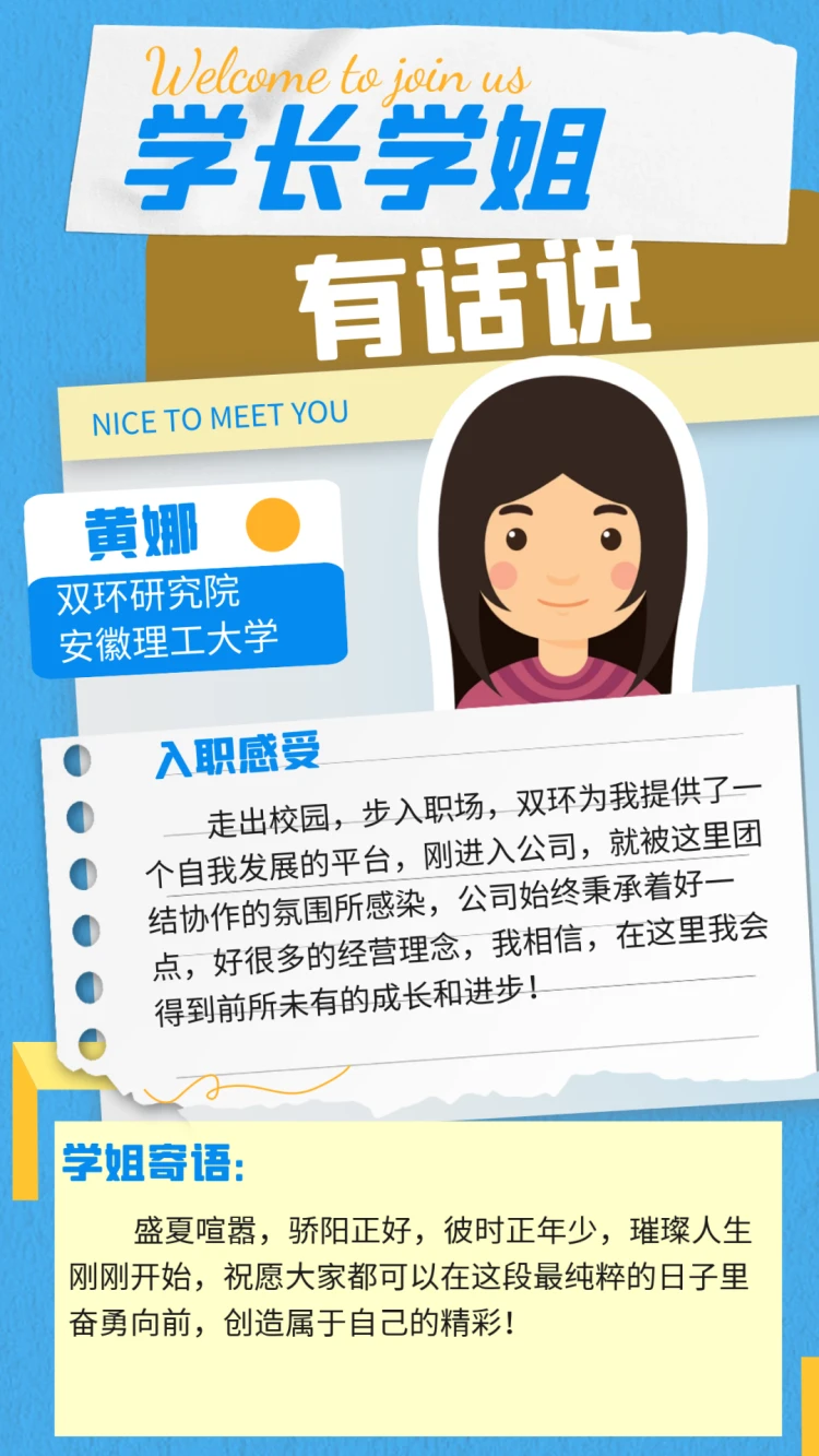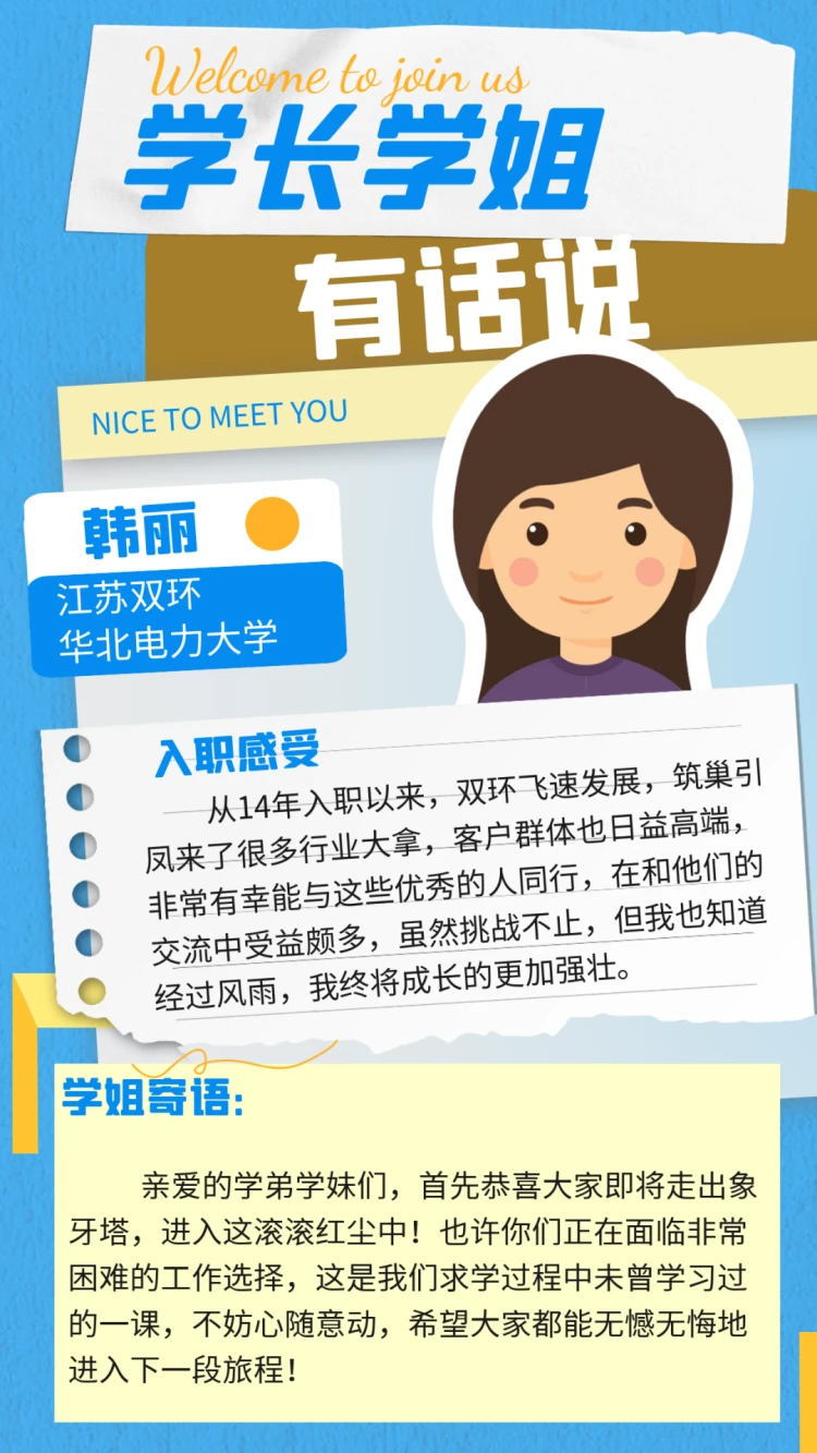 对于正在择业的学弟学妹们,双环的学长学姐给出了自己入职双环的一些切实感受和真诚寄语,正在观望的你不妨看看学长学姐们的精彩分享吧。