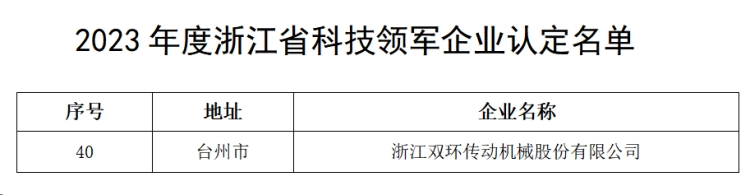 近日,浙江省科技厅发布了《2023年度浙江省科技领军企业名单》,双环传动成功入选“2023年度浙江省科技领军企业”榜单。