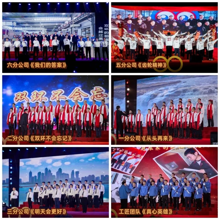 双环本部各分公司及工匠团队为大家带来了充满激情的大合唱。合唱歌曲由各团队根据分公司的现状、目标、未来及岗位性质,对歌曲进行改编,悠扬的歌声和颇具创意的舞台表演赢得了现场声声喝彩。经过激烈PK,六分公司《我们的答案》荣获第一名,五分公司《齿轮精神》、二分公司《双环不会忘记》荣获第二名,一分公司《从头再来》、三分公司《明天会更好》以及工匠团队《真心英雄》荣获第三名。