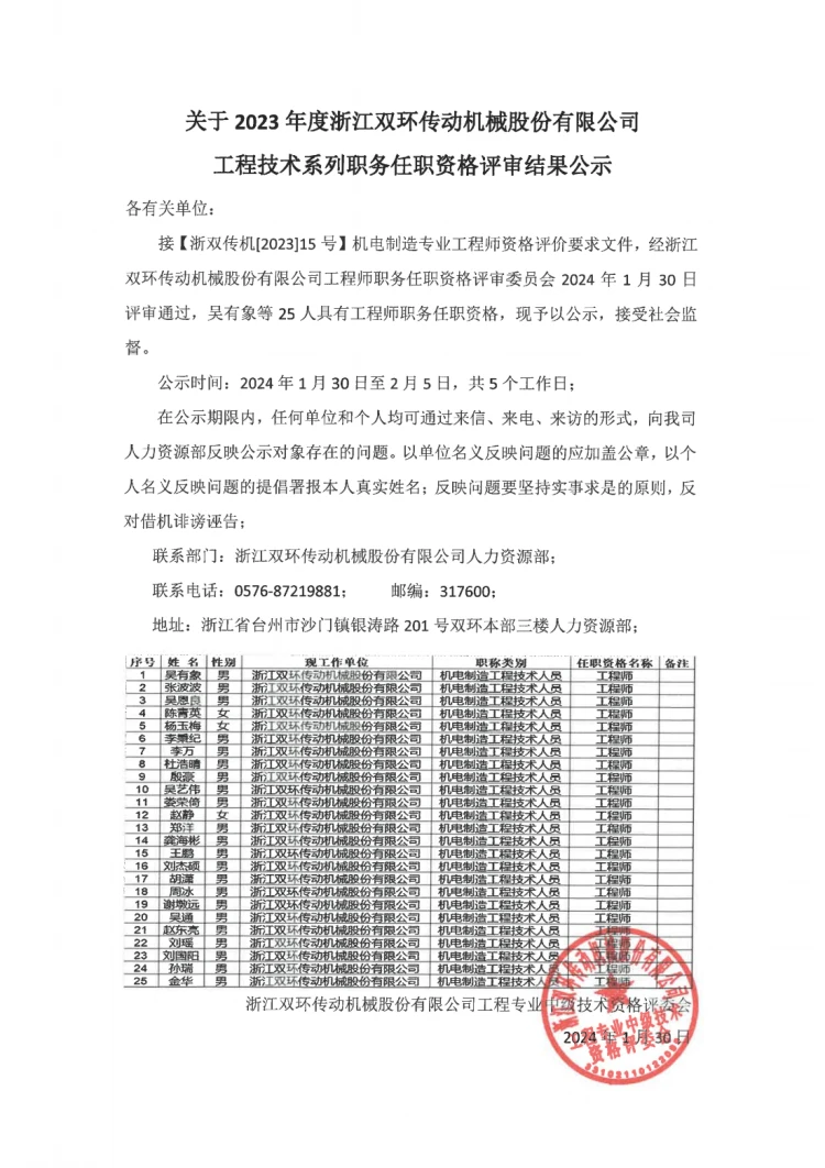关于2023年度浙江双环传动机械股份有限公司工程技术系列职务任职资格评审结果公示
