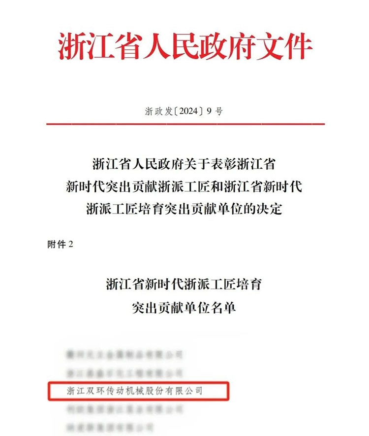 喜报!双环传动荣膺浙江省新时代浙派工匠培育突出贡献单位