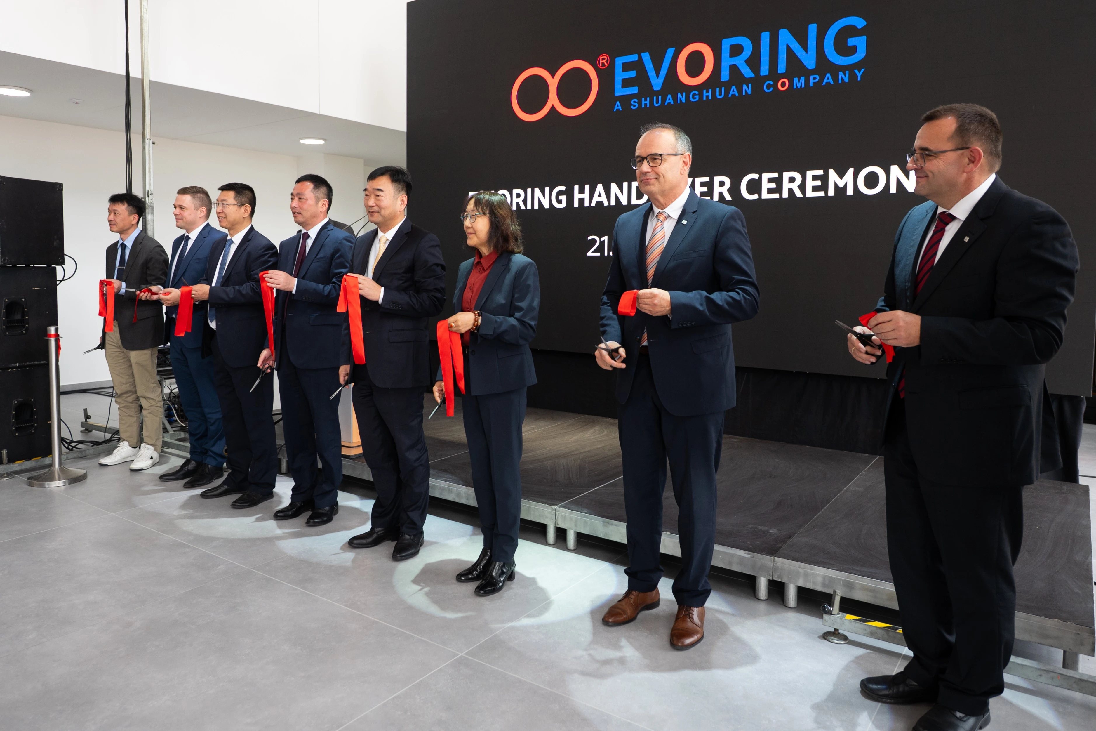 淮安市淮安区委书记颜复及政府代表团,匈牙利罗兰大学叶秋月教授,双环传动顾问刘小稚老师,双环传动公司领导吴长鸿、张民、蒋亦卿、李水土、王佩群、陈海霞、周志强、张戎、敬代云,以及新厂房基建承包商Merkbau、新厂房建设项目管理及监理公司Greenfield代表等出席交接仪式,共同见证这一里程碑时刻。在雷鸣般的掌声中,交接仪式隆重举行,标志新厂房正式交付,EVORING迎来了新的发展阶段。