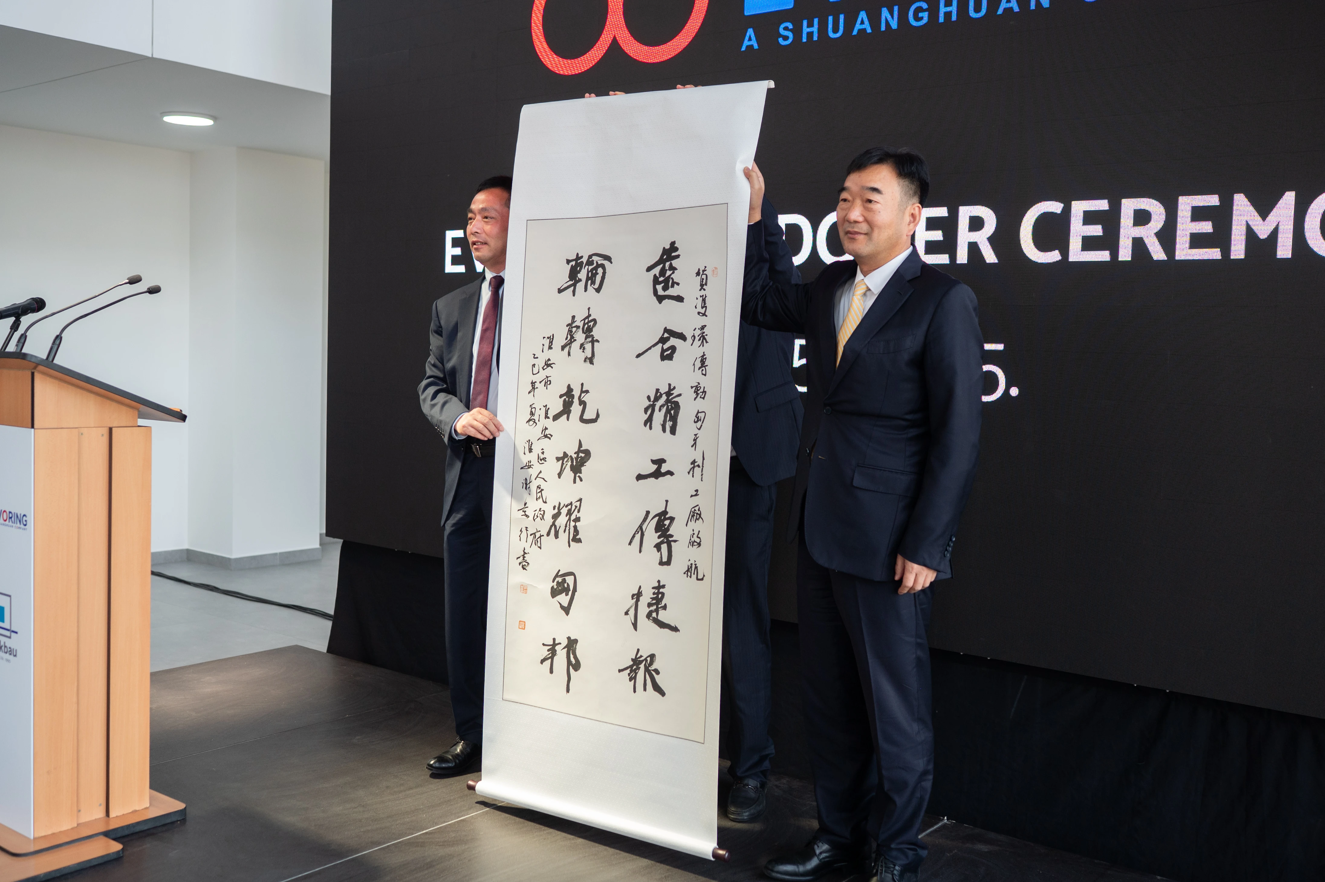 淮安区委书记颜复在致辞中,对双环传动EVORING项目取得的成果表示高度赞赏,对中匈两国企业文化团队的成功合作表示诚挚祝贺。他充分肯定了中国企业“走出去”战略的积极成效,表示双环传动这一海外战略的成功落地,不仅实现了公司的国际化发展,也为宣扬中国企业文化、推动中外文化交融做出了积极贡献。他还在现场向EVORING团队赠礼书法作品,并表示“这不仅是中国智慧的结晶,更是中匈合作的生动注脚。”