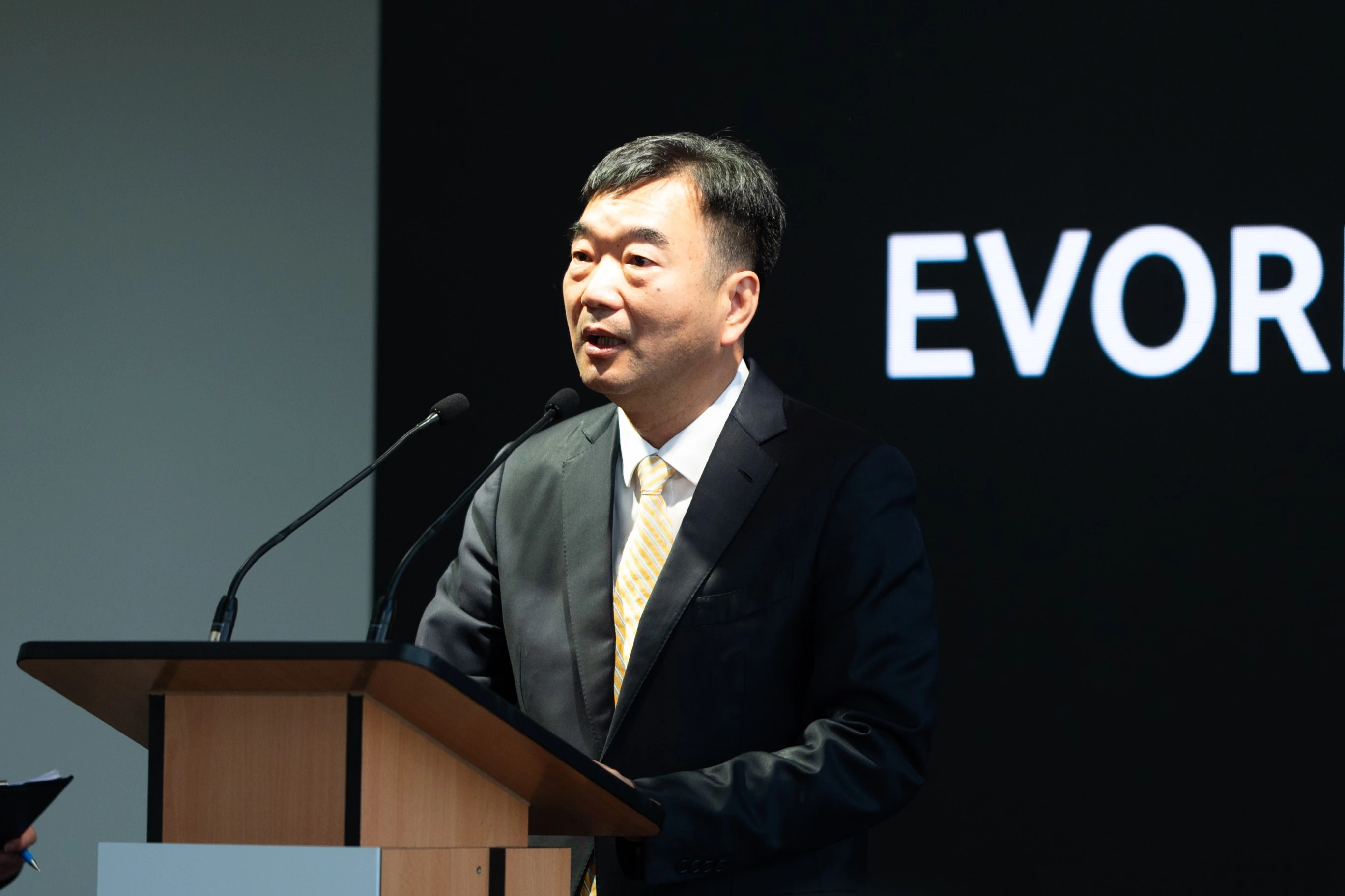 双环传动董事长吴长鸿发表致辞。他首先向远道而来的淮安区政府一行、圆满完成EVORING厂房建设任务的各合作单位,以及辛勤付出的EVORING全体同仁和出海团队表达诚挚祝福与衷心感谢。