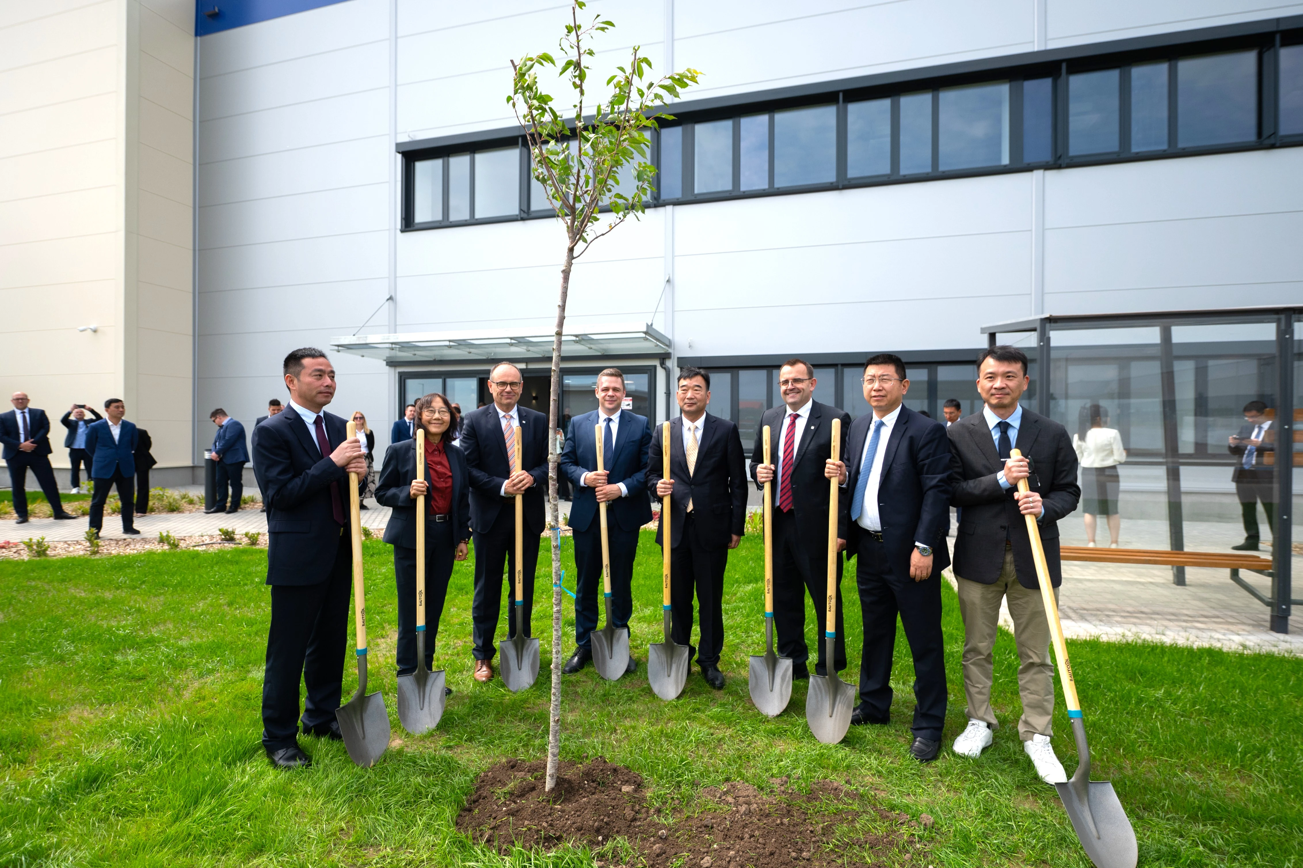 交接仪式结束后,与会领导、嘉宾共同参观了新厂房,包括办公区域、生产线规划区等,详细了解了工厂设计理念与功能布局,对EVORING的现代化、国际化建设成果给予高度评价。参观环节结束后,本次活动特别设置 “植树仪式” 作为象征性纪念环节,与会领导与嘉宾现场共同栽种三棵纪念树,以 “根植本地、共同成长” 的美好寓意,为活动留下富有生命力的印记。
