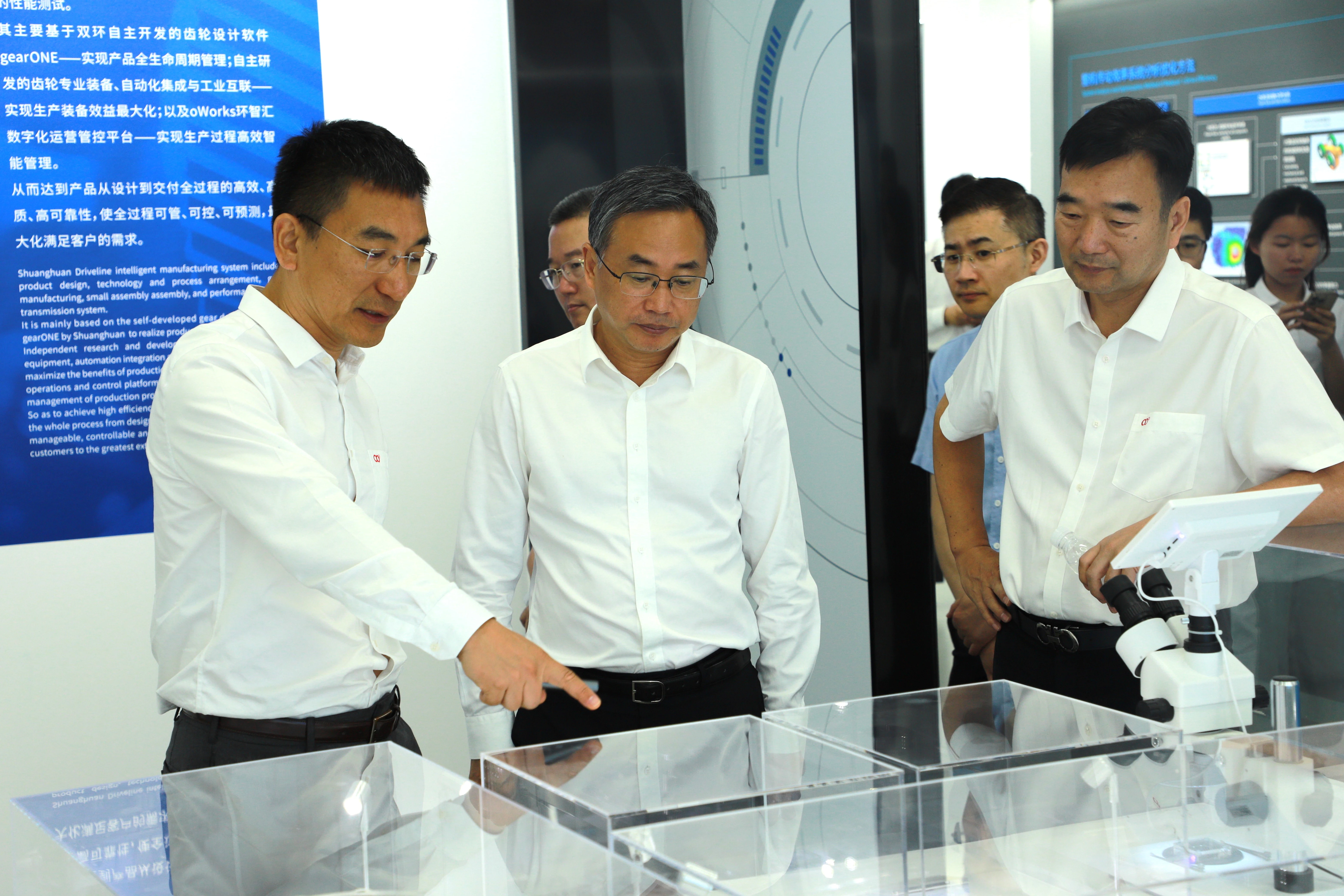 在吴长鸿等人的陪同下,许洪斌一行参观了双环研究院展厅,详细了解了双环的发展历程、业务布局、技术创新成果、智能制造、公司产品等,感受双环在齿轮制造领域数十年如一日的坚守,对双环在技术创新、数字化转型、市场拓展等方面所做出的努力和取得的成果表示充分认可。吴长鸿表示,双环传动成立45年来,始终坚守齿轮主业、坚持科研创新,实现了同心多元化发展。双环技术上的突破源于“好一点,好很多”的坚持,这种对极致的追求,是一种始终传承的企业文化。
